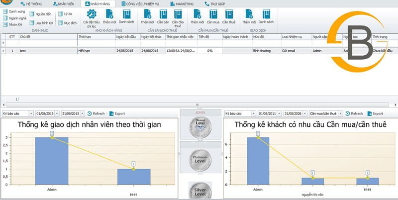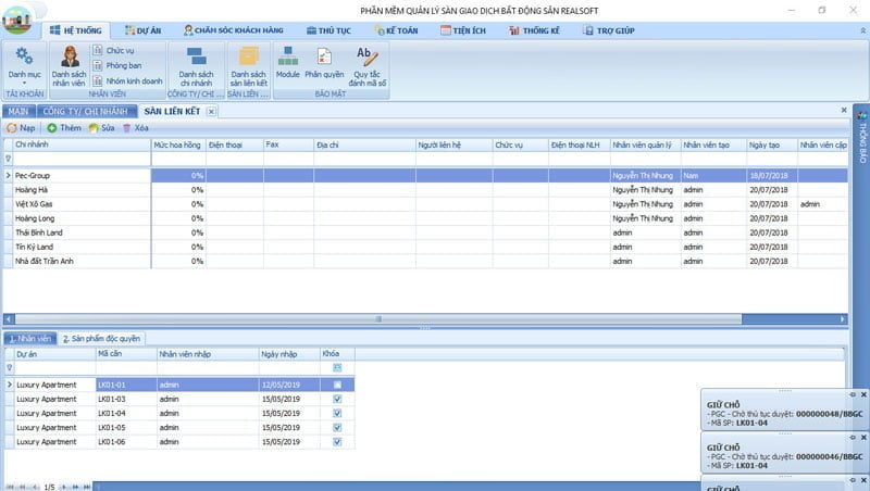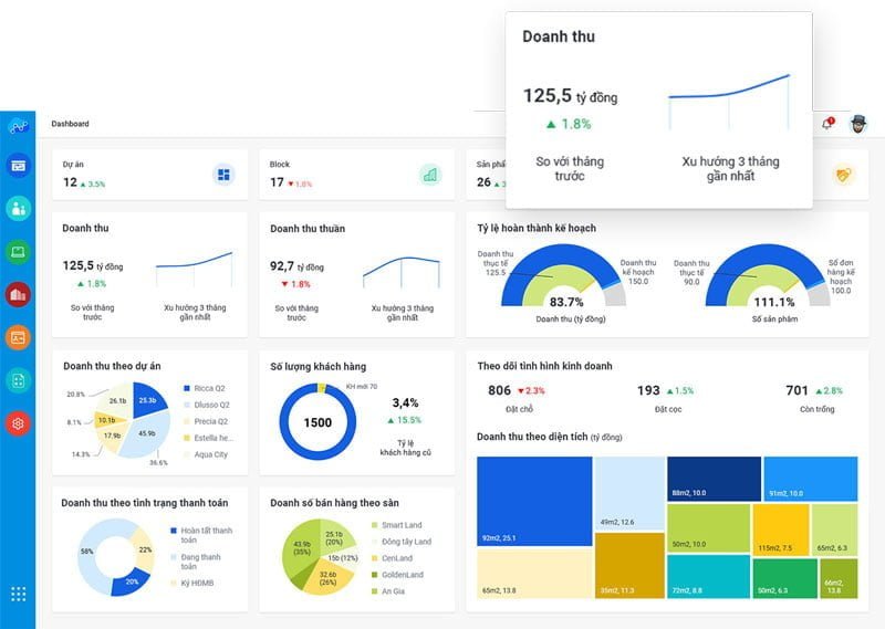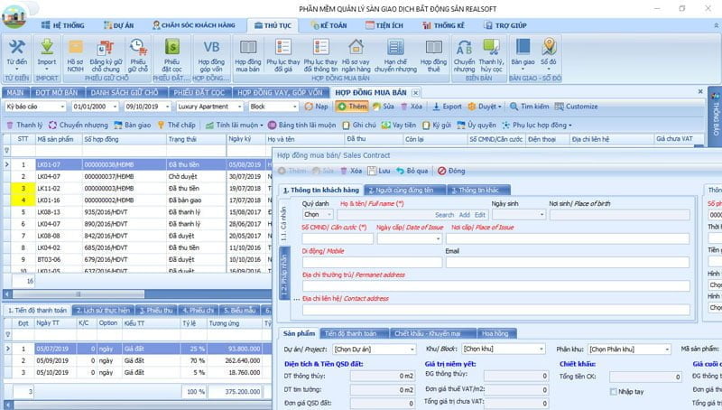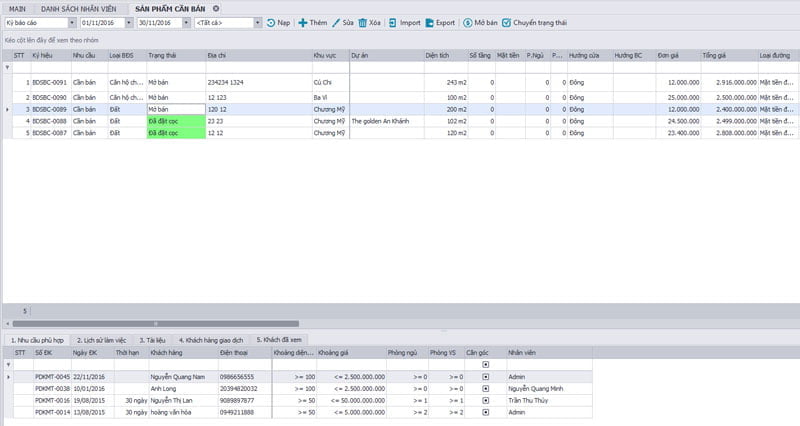 - Quản lý giao dịch. Phầm mền này giúp các doanh nghiệp theo dõi các giao dịch từ giai đoạn booking sản phẩm, đặt cọc, ký hợp đồng mua bán, nhận bàn giao sản phẩm.